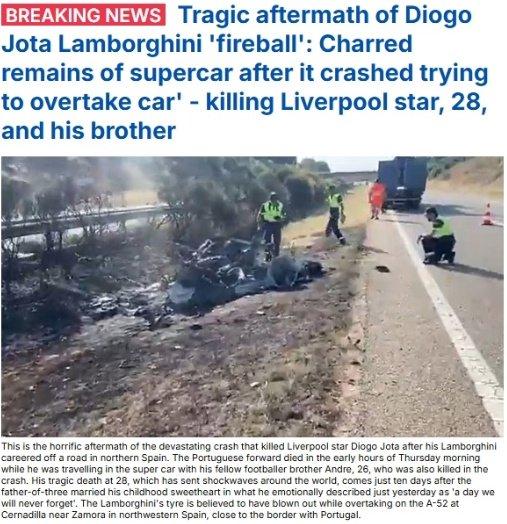报道称,利物浦前锋若塔驾驶的兰博基尼在超车时突然爆胎,车辆翻滚起火。28岁的英超冠军得主与同车的弟弟当场殒命——此时距离他捧起欧国联奖杯仅过去24天,距离他与青梅竹马的爱人那场盛大婚礼,才过了短短11天。当社交媒体上婚礼纪录片里的笑容尚未褪色,现实已为这位足坛巨星奏响了安魂曲。