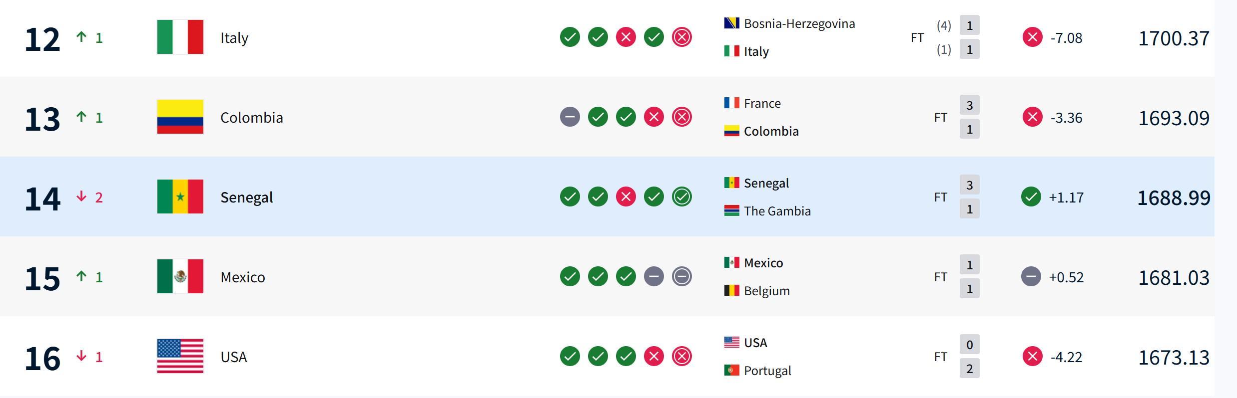 4月1日,这一国际比赛日全部结束,FIFA公布了最新世界排名。颇为有趣的是,塞内加尔队在这一国际窗口期两场比赛均取得胜利,但排名反而下降2位,而意大利队在附加赛决赛负于排名不如自己的波黑队,无缘晋级世界杯,可排名却反而上升了一位。原因主要与非洲杯决赛结果有关。