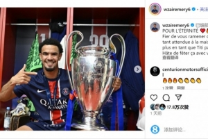体育资讯6月2日讯 欧冠决赛,扎伊尔-埃梅里替补出场,巴黎5-0国米,获得冠军。 扎伊尔-埃梅里社媒晒出与奖杯的合照,配文:“永恒的荣耀!很自豪将这座期待已久的奖杯带回家,作为一个巴黎人尤其如此。” 迫不及待想与你们一起庆祝。”