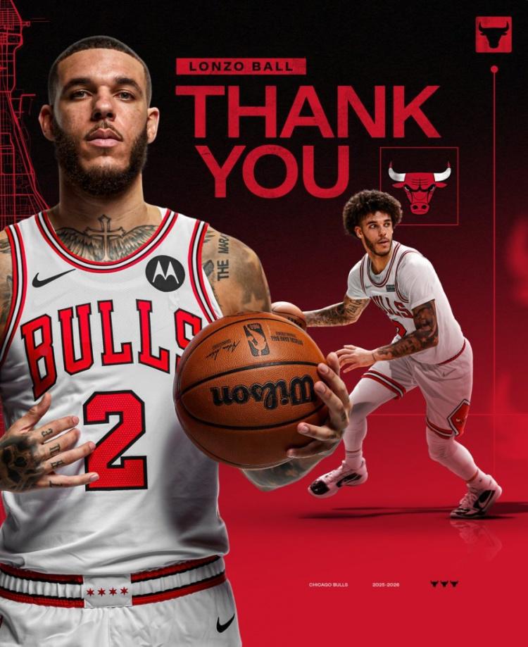 公牛官方致谢朗佐-鲍尔道:“你的故事是体育界最精彩的凤凰涅槃之一。感谢你,并祝你好运!”