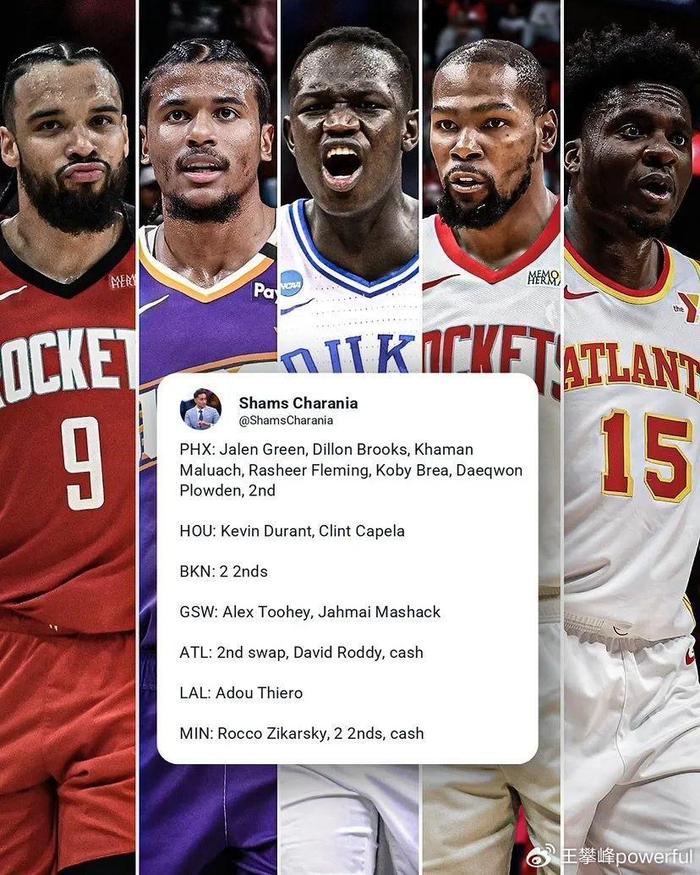 火箭官方宣布,通过7方交易,得到杜兰特和卡佩拉。,
